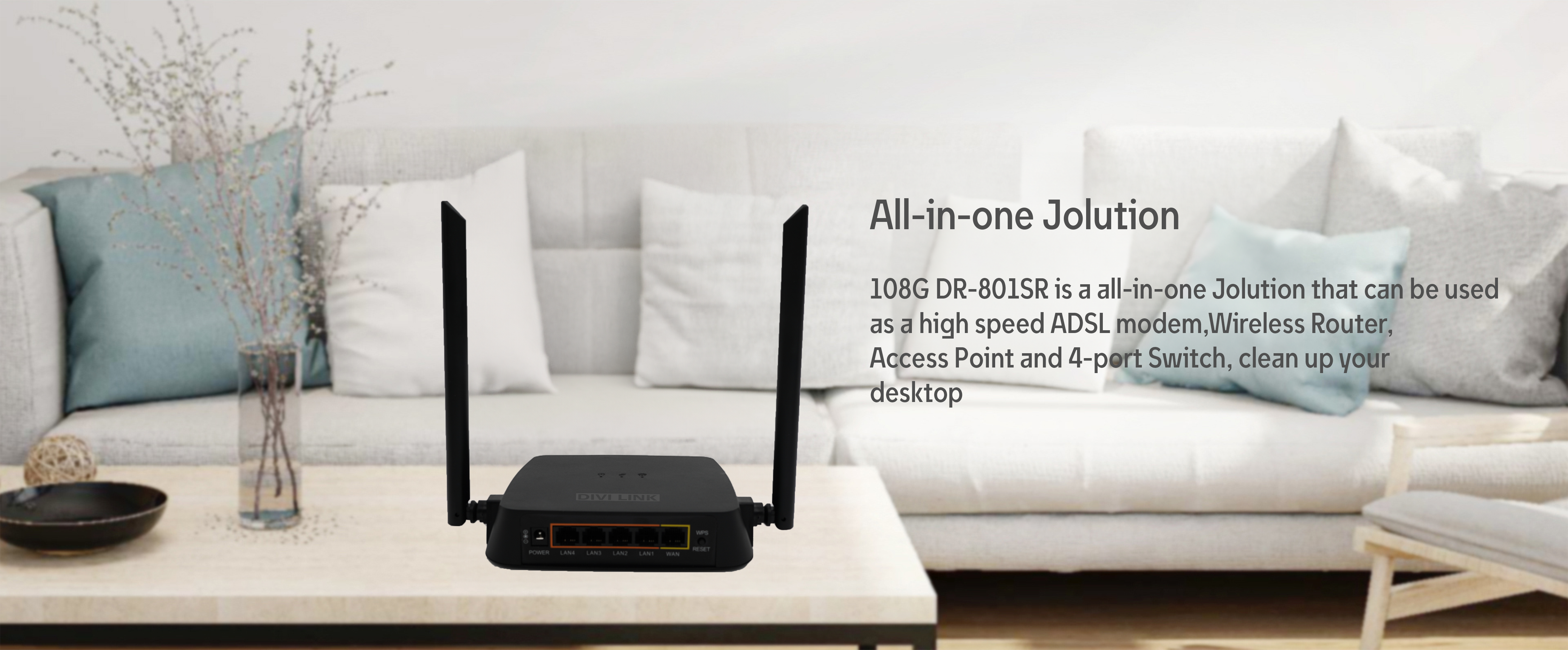 - Combines functions of high speed ADSL Modem, wireless router and 4-port switch.
